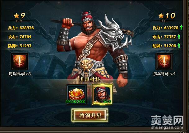 9星升10星,兵力:628936变633978,攻击:76784变77357,防御:51293变51706,厉兵秣马Lv.3变厉兵秣马Lv.4,升星材料需要升星丹2000颗,张飞3个,将领需达到90级。