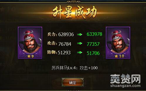 5星升6星,兵力:616331变618852,攻击:75400变75670,防御:50259变50465,盾墙Lv.2变盾墙Lv.3,升星材料需要升星丹400颗,张飞1个,将领需达到50级。