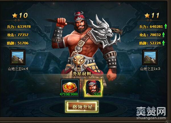 4星升5星,兵力:615070变616331,攻击:75266变75400,防御:50155变50259,山地之王Lv.2变山地之王Lv.3,升星材料需要升星丹200颗,张飞1个,将领需达到40级。