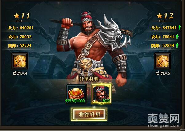 升到50级后,5星升6星,兵力:616331变618852,攻击:75400变75670,防御:50259变50465,盾墙Lv.2变盾墙Lv.3,盾墙Lv.3:减免弓兵伤害20%。