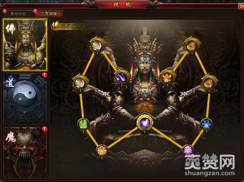 在跳出五行天地外,一切情皆三界中。三界是为佛、道、魔,若能超脱,永离生死,不复往返六道,才为圣人。玩家点击游戏界面右下角的“技能”,进入到三界突破面板。