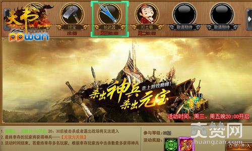 杀出神兵换而言之就是抢武器,是ppwan《天书世界》中的限时活动之一,只有每周三、周五晚20:00才会开启。猩红的战场蔓延着无尽的厮杀,谁能站到最后,谁击杀的数量最多,谁将会是这场战争的王者!PS:每位玩家在战场中都有3次复活机会,20:30后被击杀或者退出战场的玩家将无法进入!