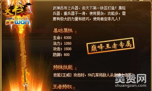 此神兵不仅可以为玩家带来大量的属性加成、特殊技能王威:攻击时,5%几率将敌人从坐骑上击落,在ppwan《天书世界》中还具有王者特权,上线将会世界公告提示:“王者来袭,抢武器达人某某上线了……”彰显你的与众不同与非凡风采!在ppwan《天书世界》走上游戏的巅峰,唯神兵在手尔!