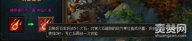 真·赤焰火海:召唤投石车投放5个火石,对被火石砸到的敌方单位造成伤害,投放火石的区域持续燃烧3秒,死亡后再放一次技能。 获得方式:兵器升1阶