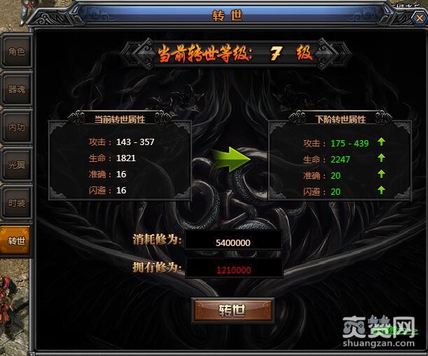 每次进行转生时,转世属性都会有所增长。主要增长的是四大属性,它们分别为:主角的攻击、主角的生命、主角的准确以及主角的闪避。主角的攻击增长的是主角的三大攻击属性:物理攻击、魔法攻击以及道术攻击;主角的生命增长之后,就会更加耐打。主角的准确增长后,可以提升攻击时的命中率。主角的闪避增长后,可以提升被攻击时的闪避率。