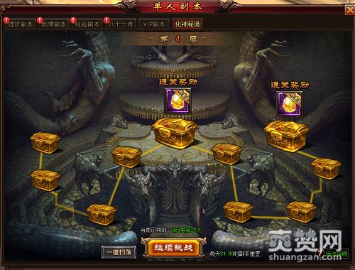 在战斗中,我们可变化成神将获得惊天动地的神力,但是想要提升化神等级,获得更加强大的力量,化神秘境是一个必选之路。点击游戏界面右上角的“单人副本”即可打开副本界面,点击“化神秘境”,即可进入秘境。