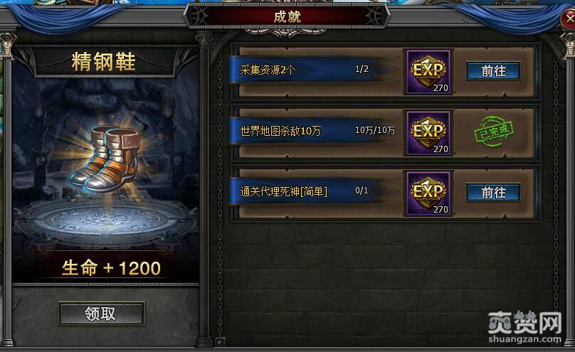 成就的第一件装备奖励是精钢鞋。要想获得这件装备,你必须满足以下3大成就条件才能够领取。它们分别是:
