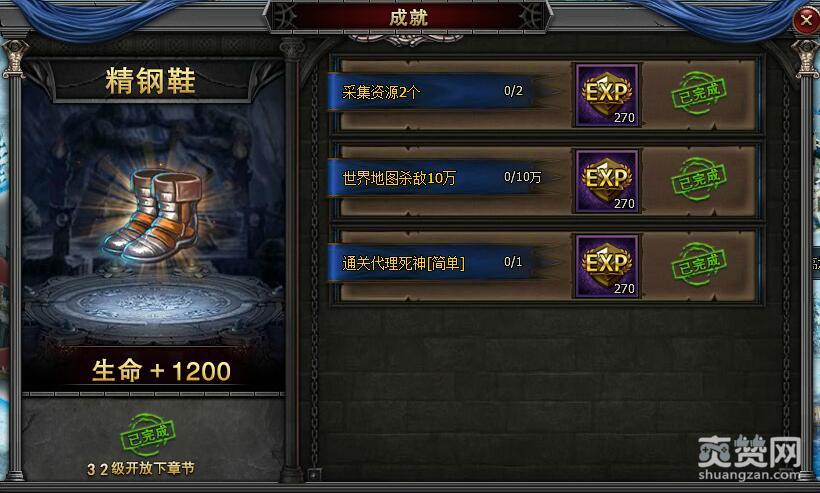以上三大成就条件达成后,就能领取精钢鞋,下一章节的成就任务要等到32级才能开启,敬请期待。