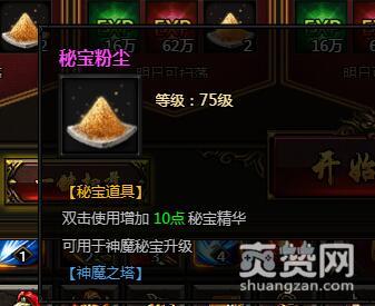 关于奖励中提到的秘宝粉尘。双击使用增加10点秘宝精华,可用于神魔秘宝升级。