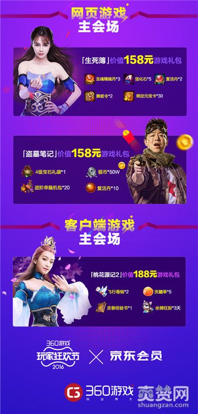 近日,360游戏与京东达成跨界合作,360游戏玩家狂欢节正式入驻京东会员,为京东会员和广大玩家准备了总价值高达2017万元的超值游戏现金礼包。在12月活动期间,玩家只要登录京东会员的360游戏玩家狂欢节活动主页,即可凭京豆在手机游戏、网页游戏、客户端游戏三个会场,兑换手游《幻城》、《黑衣剑士》,页游《生死簿》、《盗墓笔记》以及端游《桃花源记2》超值游戏礼包。除了特定游戏礼包外,360游戏玩家狂欢节还准备了360游戏平台通用充值5元红包卡,力求让每个玩家都能乘兴而来满载而归。