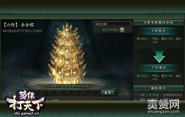 升阶过程中,玩家主要使用相应宝物的碎片,在10次升星中成功7次,宝物即可升阶。
