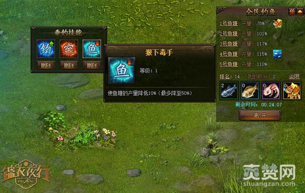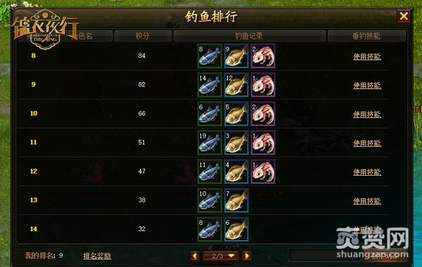 千万不要以为垂钓就只是打发时间的方式哦!在《锦衣夜行》中,靠近鱼塘即可进行钓鱼,点击“抛竿”,抛竿条上的区域越深,钓到高级鱼的概率也就越大,但要主要的时鱼篓中只能存放最多5条鱼,千万要记得收篓哦。玩家在钓鱼的过程中还可以使用各种技能,比如缩短收杆时间、一杆双鱼等等,甚至可趁其他玩家也在钓鱼的机会,查看他们的竹篓,趁机偷走对方钓到的鱼哦!