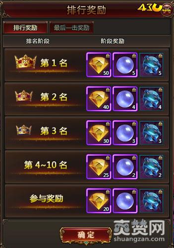 对首领造成过伤害的玩家在首领死亡时都可以获得奖励,而且排名越靠前奖励越丰厚。对BOSS累积造成一定伤害还可获得目标奖励。当首领被击败后,奖励会通过邮件的方式发放给对首领造成最后一击的玩家。另外玩家每天还有一次免费激活三倍奖励的机会哦!