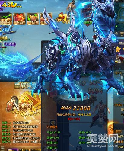 皇族勋章就更牛啦!只需888元宝就可享皇族勋章BUFF、每天3次免费原地复活、自动参与PVP活动、每天额外抢红包3次、离线3倍领取经验、提升野外BOSS百分之10黑人积分。激活即送坐骑高级潜能丹、海神盔甲、海神水龙兽,每天返绑定元宝*300、潜能丹礼包*4。