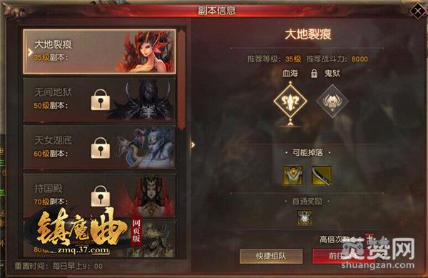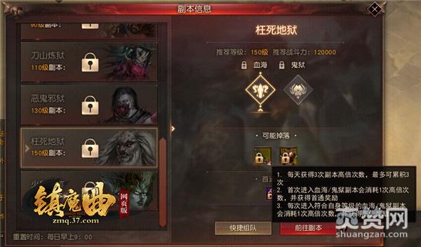 37《镇魔曲》网页版的神兵幻境分为血海难度和鬼狱难度,挑战不同的难度,所获得的奖励也不一样,难度越高,奖励越丰富,有条件的玩家还可以花费50元宝开启高倍次数,每天可获得6次副本高倍次数,最多累积6次,首次进入血海/鬼狱副本会消耗1次高倍次数,并获得首通关奖励和高倍奖励。
