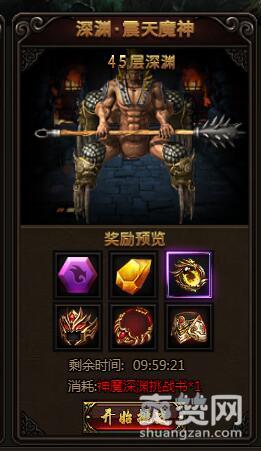 深渊·震天魔神。盘踞在45层深渊之中,也就是说当玩家通关普通模式第45层,就有一定概率会刷出这个BOSS来。