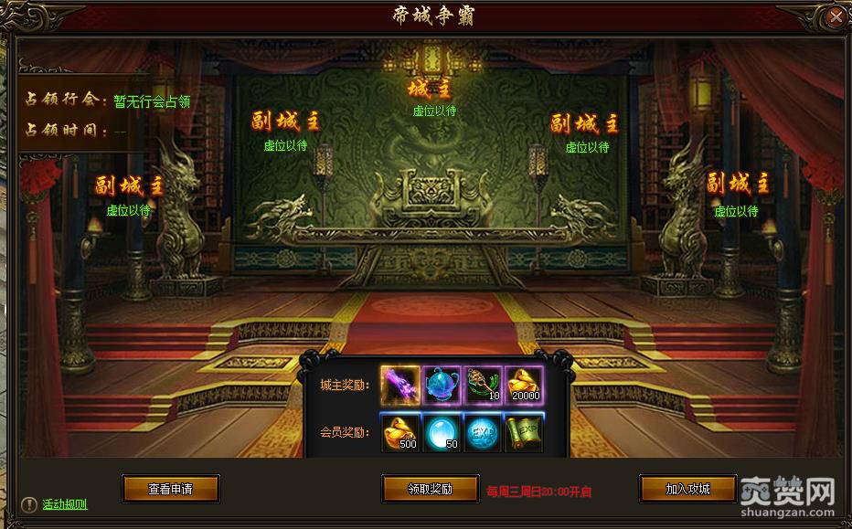 帝城争霸可是激烈无比!英勇的你一定要去体验一下什么叫刺激哈!想要参与帝城争霸首先得加入行会或者创建自己的行会哦!攻城战开启后参与活动的所有玩家都可获得大量经验,并且活动期间再帝城可获得10倍经验泡点,在皇宫内则可获得20倍经验泡点哈!活动结束时皇宫内人数最多的行会将取得攻城战胜利!