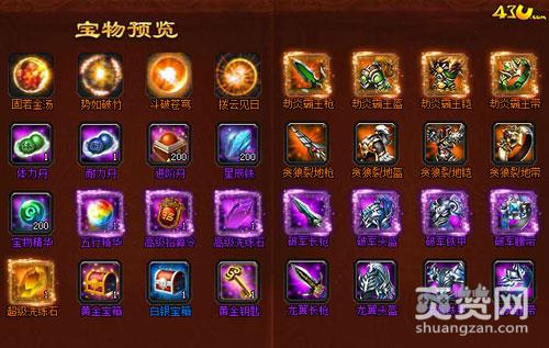 永固的固若金汤、提升攻击的势如破竹、提升伤害的斗破苍穹、提升免伤的拨云见日、增加耐力的耐力丹、用于宝物升星的宝物精华、贪狼裂地系列装备、劫炎霸王系列装备、集天地五行与一身的五行精华、黄金铸造而成的黄金钥匙、高级招募令、超级洗练石等宝物都会有哦!