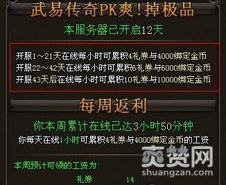 只要登录923yx《武易》,点击屏幕右上角的“福利”图标,即可进入战神福利面板。战神福利中有大量福利可以领取,每周工资和在线奖励就是其中之二。每周工资由两部分组成,一是累计签到拿礼包,另一个是每天累计在线时长获大礼。而在线奖励则是根据开服时间的不同,每在线1小时,可获得不同数量的礼券和金币。