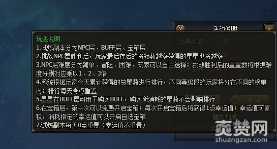 1.试炼副本分为NPC层、BUFF层、宝箱层