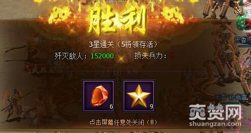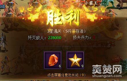 胜利后获得试炼石*6、星星*9。笔者3星通关获得这些道具,如果2星通关,获得的道具会相应减少,3星通关的条件是5将领均存活。