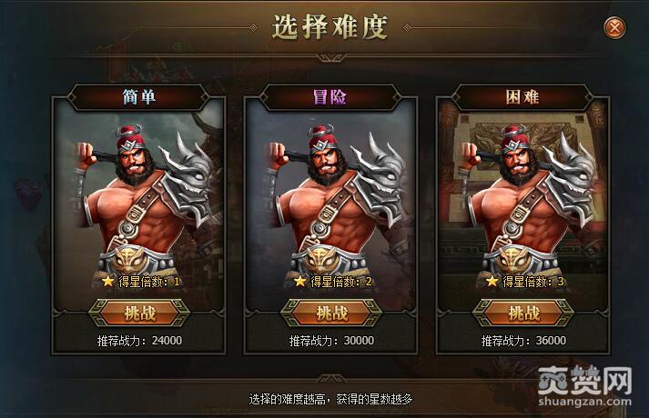 3.NPC层难度分为简单、冒险、困难,玩家可以自由选择;挑战胜利后的星星数将根据难度分别对应乘以1、2、3倍。