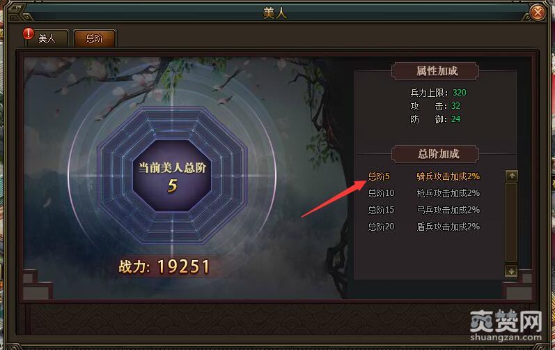 进阶成功后,当前美人总阶会往上提升1阶,小编目前总阶达到5阶,战力提升到19251。属性加成方面——兵力上限:320(提升0),攻击:32(提升0),防御:24(提升0)。同时激活骑兵攻击加成2%的效果。
