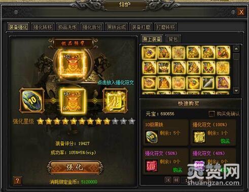 想要进入到装备强化界面,大家可以通过点击主界面的熔炉图标进入。目前,装备强化最高可以达到+12,每强化1级需要消耗相应的黑铁,强化失败不会降低强化等级。使用强化符文可以提高强化成功率,另外VIP还有额外的成功率加成。