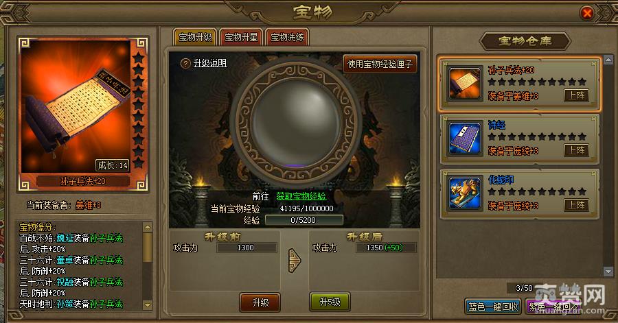 宝物升级可以直接提升攻击属性,需要用到大量的宝物经验,宝物等级不能超过君主等级,宝物经验通过声望商店购买、封地巡视、夺宝、宝物回收等方式获得!