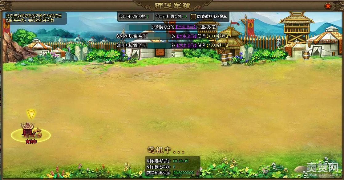 在押送粮车的时候,每个人的粮车最多被抢5次,一次抢成功就是8%,如果你押送的是紫色的50W银两,那么5次全被抢了就是20W的银两了,都快一半了。想要避免被人抢,选择押送的时间很重要,首先如果你选择的是橙色的弓箭车或者红色的官饷车,只要你开始押送了,游戏界面正上方就会推送一条XXX押送XX粮车出发,这时候如果在线的人多必然有人要去抢粮,所以针对这点,在自己的实力比较一般的情况之下,可以选择在一些在线人数少的时候,押车一趟是30分钟,大家选择半夜或者比较早的时候押送军粮会更好的避免被人抢夺!