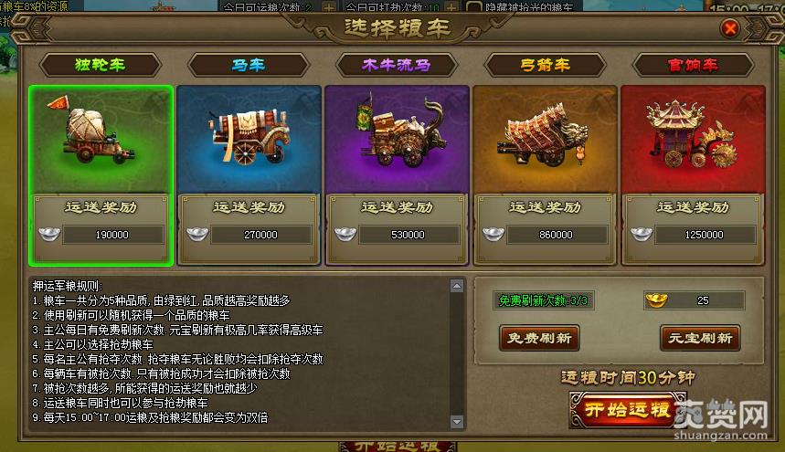 在押送军粮的时候一共有五种品质的粮车,从绿色到红色,押送的奖励10W到200W,虽然说每天都给我们三次的免费刷新机会,但一般最多也就刷新到紫色的,想要红色粮车就需要用元宝了!