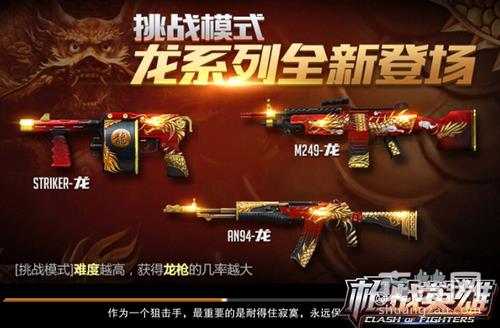 龙系列武器绝对是枪战世界里的颜值担当,【STRIKER-龙】、【AN94-龙】等武器拥有价值非凡的国风造型,红色的枪身烙上金色的龙纹,外形拉风全场瞩目!在生化模式,龙系列的重火力是你值得依赖的选择,【AN94-龙】以高射速而受到快枪手的青睐,霰弹枪【STRIKER-龙】更是以一枪爆头的伤害而著称!