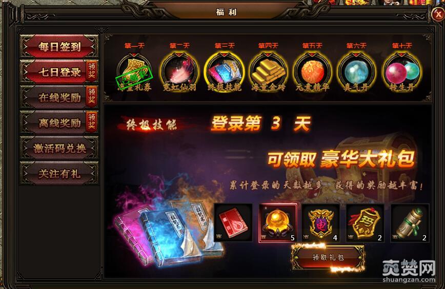 登录第三天,可领取豪华大礼包。逐日剑术*1、超级经验玉*5、雷电守卫令牌*4、玛雅通行证*2、副本卷轴*2。