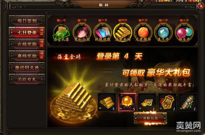 登录第四天,可领取豪华大礼包。金砖(大)*5、超级经验玉*5、588元宝*2、玛雅通行证*2、副本卷轴*2。