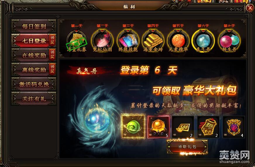 登录第六天,可领取豪华大礼包。高级真气丹(英雄)*1、超级经验玉*5、588礼券*2、玛雅通行证*2、雷电守卫令牌*4。