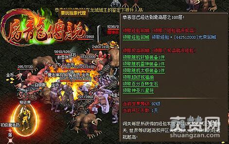 在923yx《屠龙传说》的灵符塔中,暂时一共只有一百层。其中,每一层都有强大的怪兽镇守,大家在上塔之前切记要强化好装备。只要击败每层的怪物,就可以和NPC“寂灭大师”对话,领取经验回城或者领取经验进入下一层。