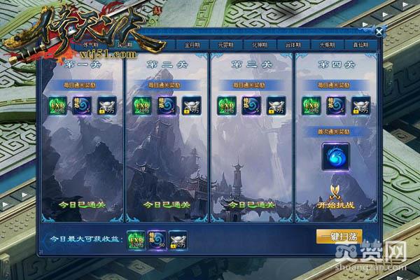 51《修天决》中,玩家开启“修天决修炼”并将自身提升至炼体期入门后,即可参与仙界历练玩法。玩家每修炼至一个境界,便可开启四个仙界历练关卡,总共可开启四十个关卡。进入关卡后,玩家需要在规定时间内击杀所有怪物即可通关。当玩家通关仙界历练历练关卡后,第二天便可通过一键扫荡快速获取已通关关卡的各类奖励啦!玩家完成任意一关仙界历练,均可获得10万经验、1万银两与5个修天决修炼丹!