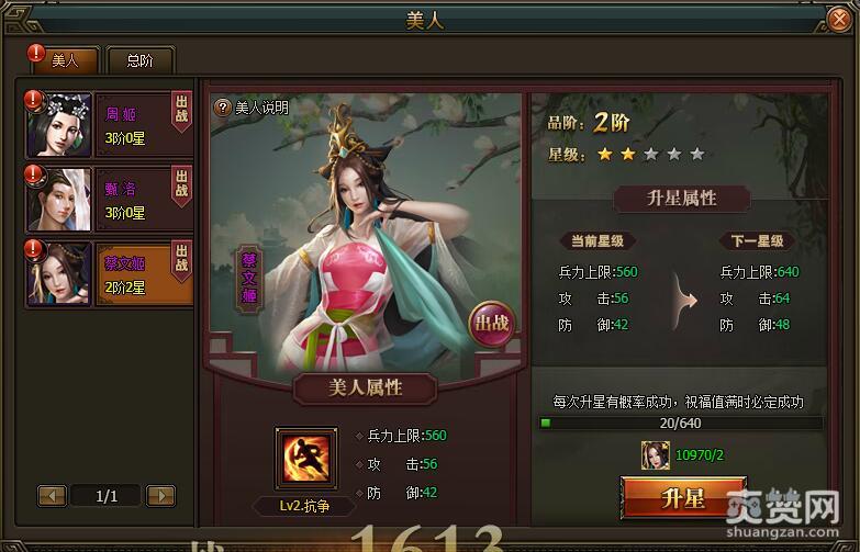 第一步:你需要激活三位美人。获得100个碎片合成1个美人,就能成功激活。激活三位美人后,你的当前美人总阶会固定为3阶。之前我们已经将美人总阶提升到8阶了,所以这里战力提升24127。属性加成——兵力上限:560,攻击:56,防御:42。