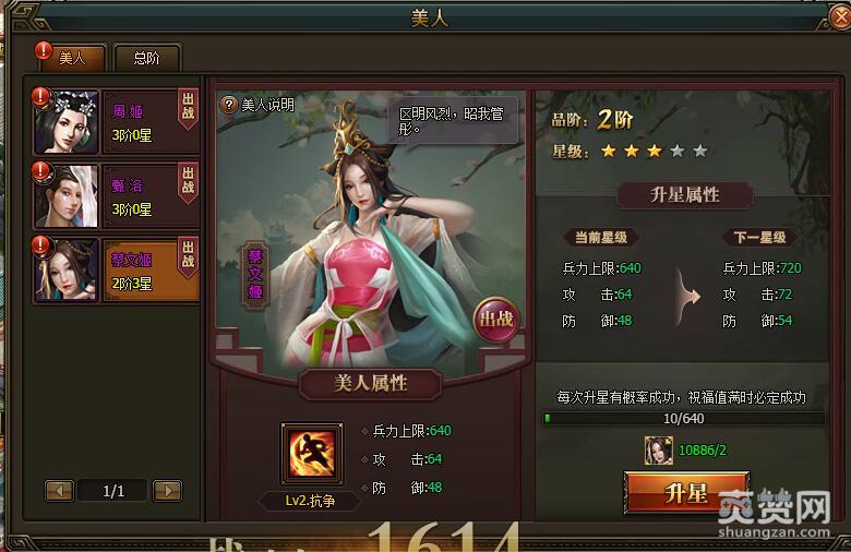 然后就是最重要的升星过程了。2阶从1星到5星升阶都是640点祝福值,每消耗2块蔡文姬碎片可以增加10点祝福值,也就是升星量表。每次升星不需要一定要到640点就升星成功,实测320点的时候就有可能升星成功的。