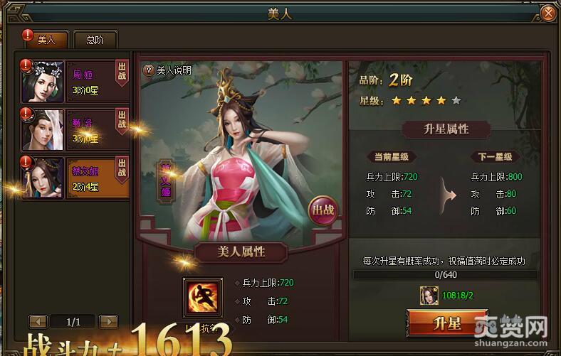 进阶成功后,当前美人总阶会往上提升1阶,小编目前总阶达到9阶,战力提升到25746。属性加成方面——兵力上限:640(提升80),攻击:64(提升8),防御:48(提升6),同时激活骑兵攻击加成2%的效果。