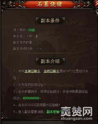 就如上图所示,萝卜玩《热血虎卫》中石墓烧猪属于副本性质,主要获得大量经验的奖励,进入的等级限制为50级,每天可以进入的上线为两次,而且每次进入都要消耗一张副本卷轴。