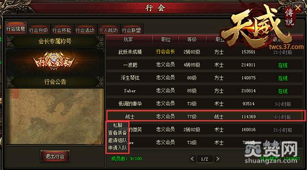 在行会界面中,左侧为行会公告,行会会长可编辑公告,将行会需要注意的事项写在公告框,同行会玩家可在行会界面左侧看到公告内容。行会右侧是玩家信息栏,鼠标左键随机点击一个其他玩家,在其名字左侧将出现一个操作栏,玩家可对其他玩家进行私聊、查看装备、邀请组队、申请入队操作。