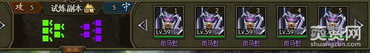 我们试着挑战一下困难难度的司马懿,进入战场,战场地形是山地,对手是5个司马懿59级。