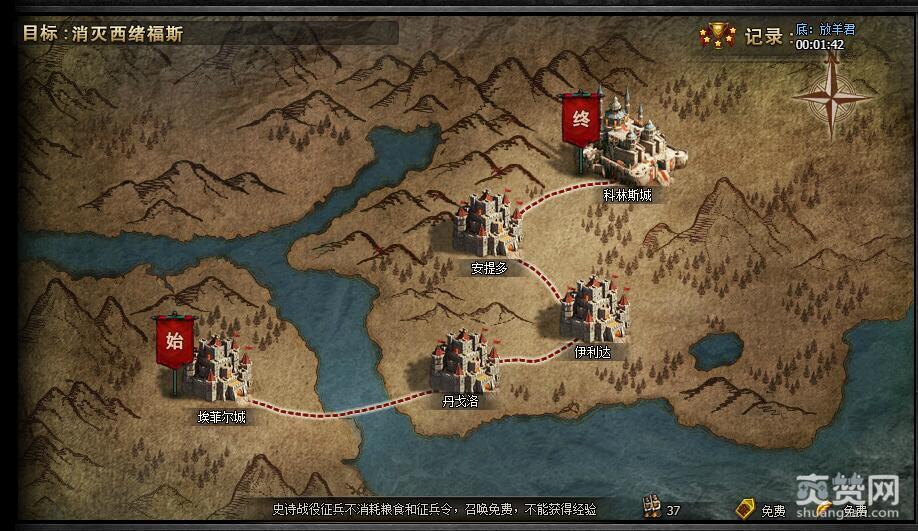 一开始,我们的武将会在起始点处诞生。也就是在埃菲尔城。目标是要占领科林斯城。行进路线方面,需要通过丹戈洛、伊利达、安提多。这三个城市都被敌方重兵把守。
