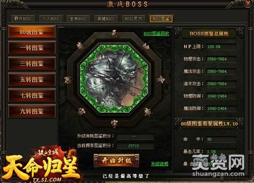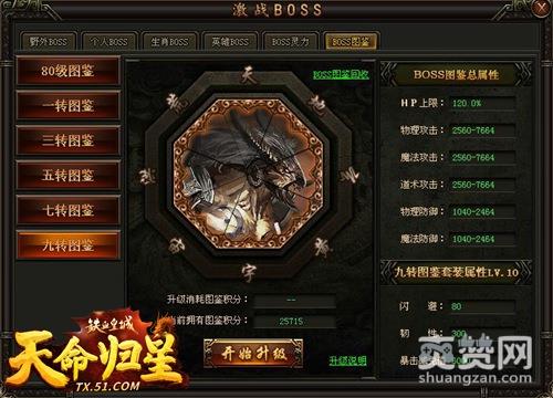 打开51《铁血皇城》挑战BOSS界面可以看到新增了“BOSS图鉴”一栏,图鉴以八卦阵为形,总共6套BOSS图鉴,一套BOSS图鉴有八块,集齐一套图鉴后就可激活套装属性,并能对套装属性升级哦!那么图鉴要怎么获得呢?这个很简单,通过野外地图的BOSS尸体就能挖出,不过50至90级地图BOSS最高挖80级图鉴;一、二转地图BOSS最高挖一转图鉴;三、四转地图BOSS最高挖三转图鉴以此类推,九、十转地图BOSS最高挖九转图鉴。