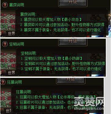 狂暴则和暴戾不同,狂暴可以极大地增加人物的必杀等级和暴击等级,这些碎片均可以通过参加活动,击杀野外怪物等方式获得,但是均不可以强化。所以只有通过不断的获取碎片来升级该技能,以获得更强的战力。