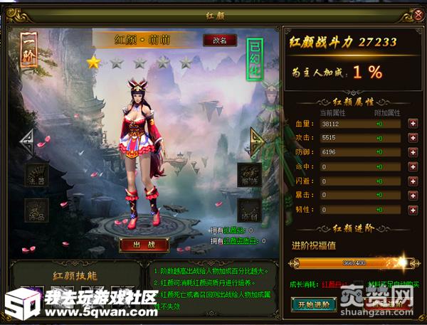 当玩家完成解救小狐仙的任务后,将会开启红颜系统。红颜会陪伴玩家进行战斗,平时就是撒娇卖萌啦。大家进入红颜系统界面,消耗红颜丹道具,可对红颜进行进阶操作,提升红颜的等级。红颜等级提升之后,红颜的造型会发现变化,而且属性效果也会大幅增强。凡劫红颜系统共有10阶,等级越高的红颜进阶消耗的红颜丹越多。