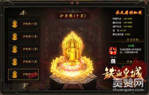 当然,全新法宝还是很有节操滴,并不是你想要就有的!当角色等级达到3转就可以开启法宝入口升级法宝可获得强大的属性加成,等级越高,属性加成越多,我仿佛已经看到自己走上人生巅峰的样子了,哈哈哈!不经一番彻骨寒,怎得梅花扑鼻香;同样升级法宝也是需要有所付出的,每升级一阶法宝就需要消耗相应数量的法宝丹,法宝丹最简单的方式当然是通过商城购买,也可以通过地图野外BOSS、转生地图BOSS、活动获得‘法宝激活后可获得法宝技能金钟罩,使用金钟罩可在一定时间内提高闪避,法宝等级越高,获得的闪避也就越高,技能的冷却时间就越短。