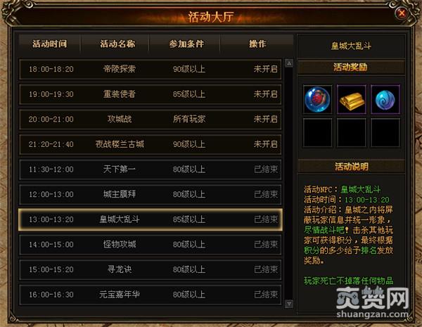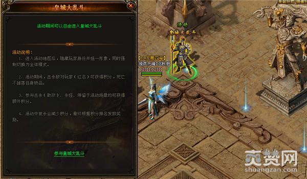 皇城大乱斗,这是在360uu《天地诸神》皇城内部展开的一场史无前例的另类PK大戏,与每晚黄金时间档展开的正式争夺战截然不同,相比较与攻城战中以行会为单位开展的群战,皇城大乱斗将会是一场个人荣誉的角斗场,玩家只需要等级到达80级后即可加入,并与每天下午的13点在楼兰古城与NPC对话即可加入战场,活动持续时间20分钟,在此时间内,你都可以自由进入战场,乱斗PK奖励丰厚,你可千万不要错过!