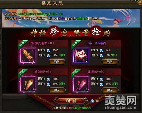 活动期间内,神秘商场每日刷新各种珍稀道具,打折出售限量抢购。神秘商场每2小时刷新一次,或花费200钻石直接刷新。神秘商场可刷出多种特惠折扣,最低可低至1折!神秘商场还可出现:完美武魂、江山如画、寻宝令等众多极品道具。